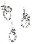 Esse nó em forma de oito. è o princípio de a maioria dos nós e se presta tanto na ponta da corda como na base dela. Para passar por uma ancoragem sem acesso e prendê-lo a qualquer ponto, para se fixar direto ao cinto. Serve também para emendas onde vais dar muita tração, facilitando assim sua soltura mais fácil. - Nove.