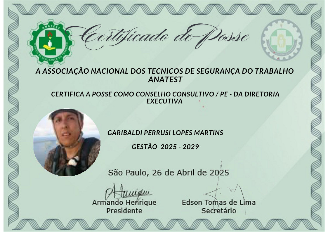 A ASSOCIAÇÃO NACIONAL DOS TECNICOS DE SEGURANÇA DO TRABALHO - ANATEST - CERTIFICA COMO CONSELHO CONSULTIVO / PE - DA DIRETORIA EXECUTIVA, GARIBALDI PERRUSI LOPES MARTINS - GESTÃO 2025 - 2029