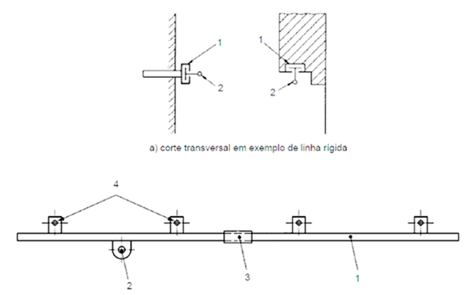 Estes dispositivos são constituídos de uma linha de ancoragem rígida como por exemplo um trilho, onde um ponto de ancoragem móvel, muitas vezes deslizante, se desloca em uma trajetória ao longo da linha rígida.